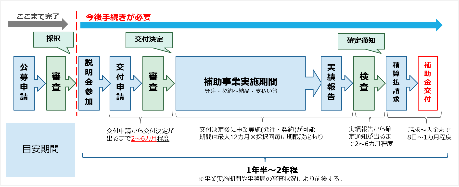 この修正指示(差戻)は少なくとも1~2回、多い場合では7~9回の修正指示を受け、これに対応しなければならなりません。このような審査を経て交付決定に至るため、交付申請から交付決定までは最短で2カ月、長い場合では4~6カ月要す場合があります。