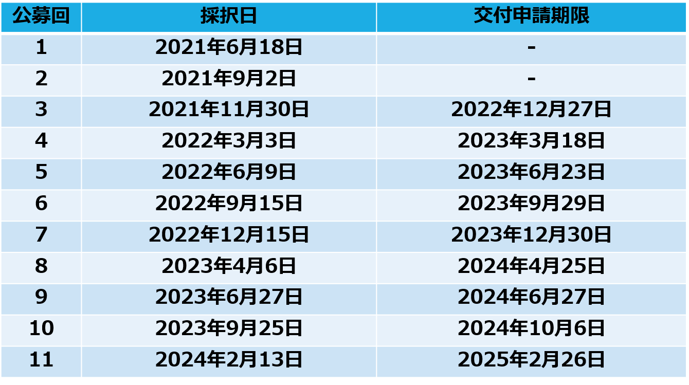 交付申請の期限は採択された公募回により交付申請期限が設定されます。3~11回公募は下記のような期限が設定されていましたので、12回公募でも採択公表日から12カ月後頃に期限が設定されることが想定されます。