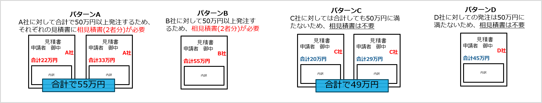 見積書は申請する全ての経費に対して必要です。また、契約先1者当たり合計税込み50万円以上の場合には相見積書(2者分)が必要です。つまり実際に発注する本見積書に加えて、価格比較をするための相見積書を2者分取得する必要があります。