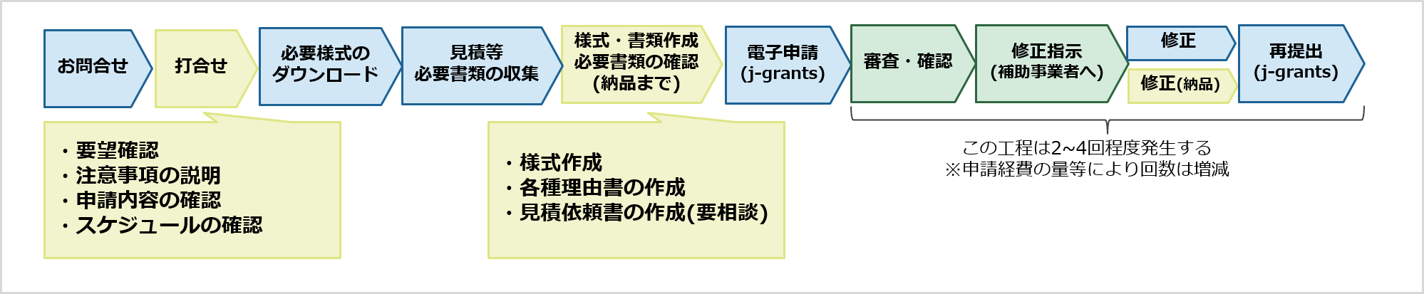 事務局指定の様式、見積依頼書、業者選定理由書等の必要書類を作成します。見積書や様式の取得及びj-grantsからの申請作業は申請事業者様よりお願いいたします。